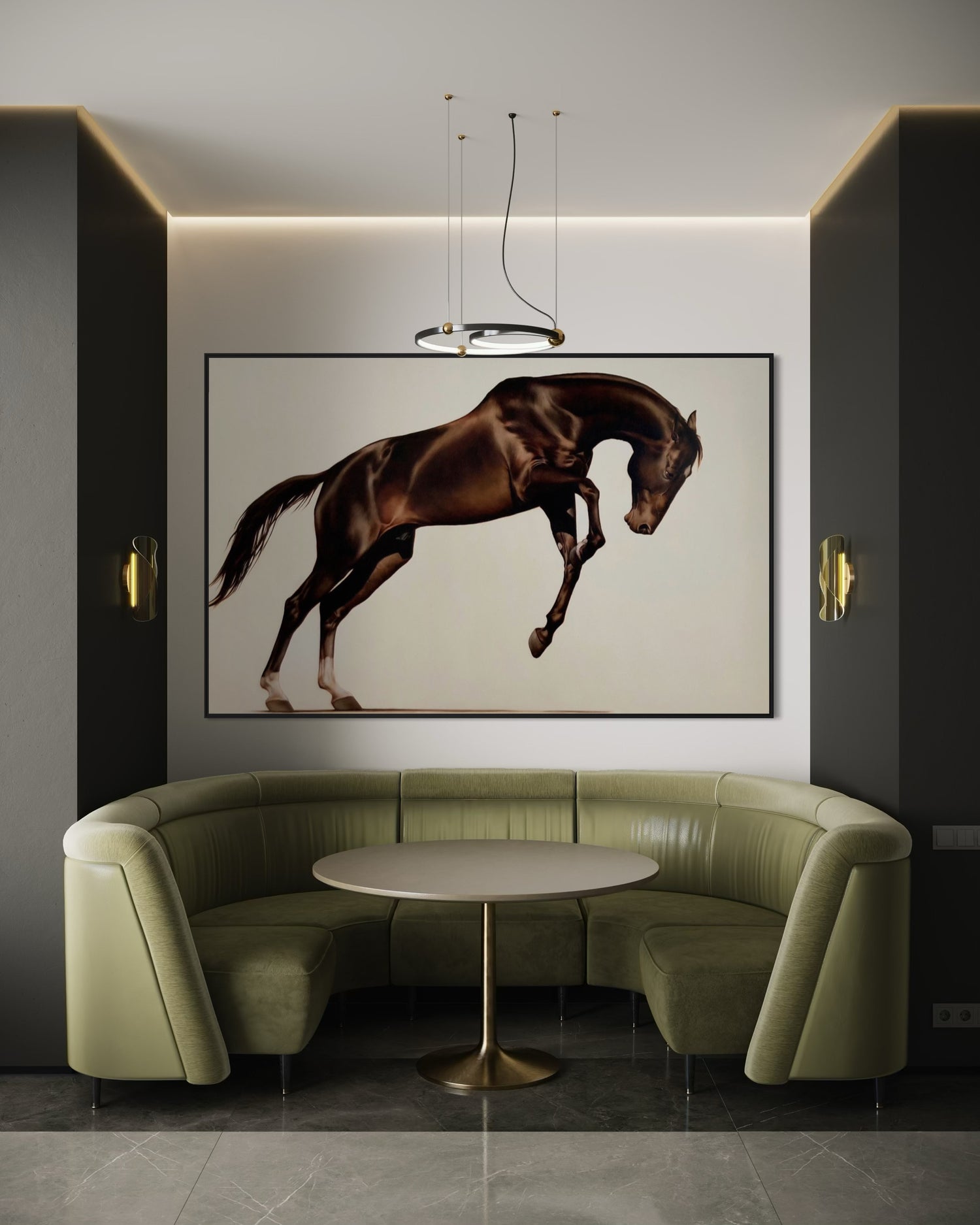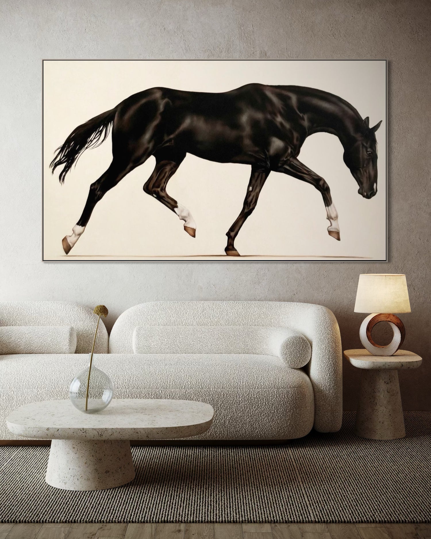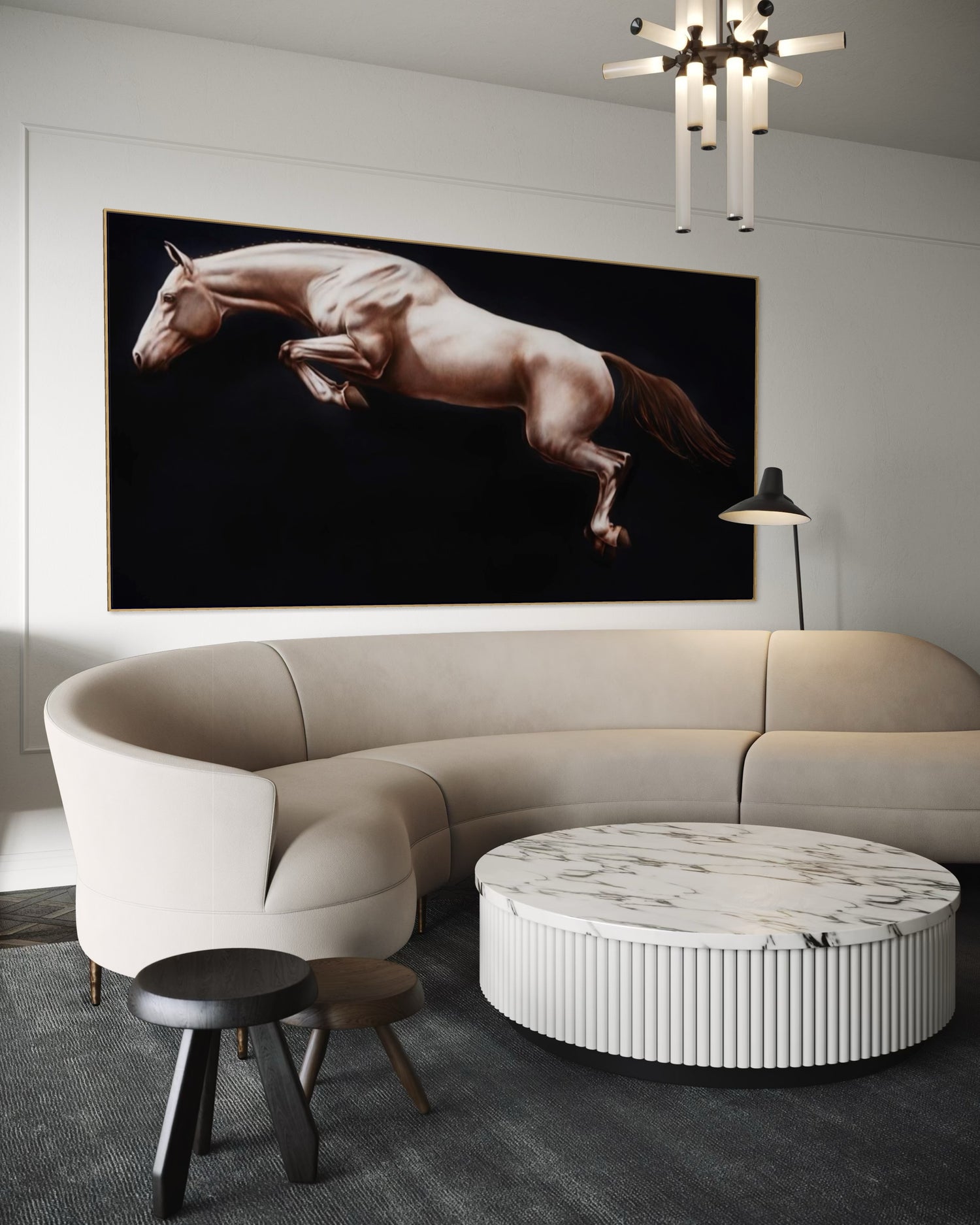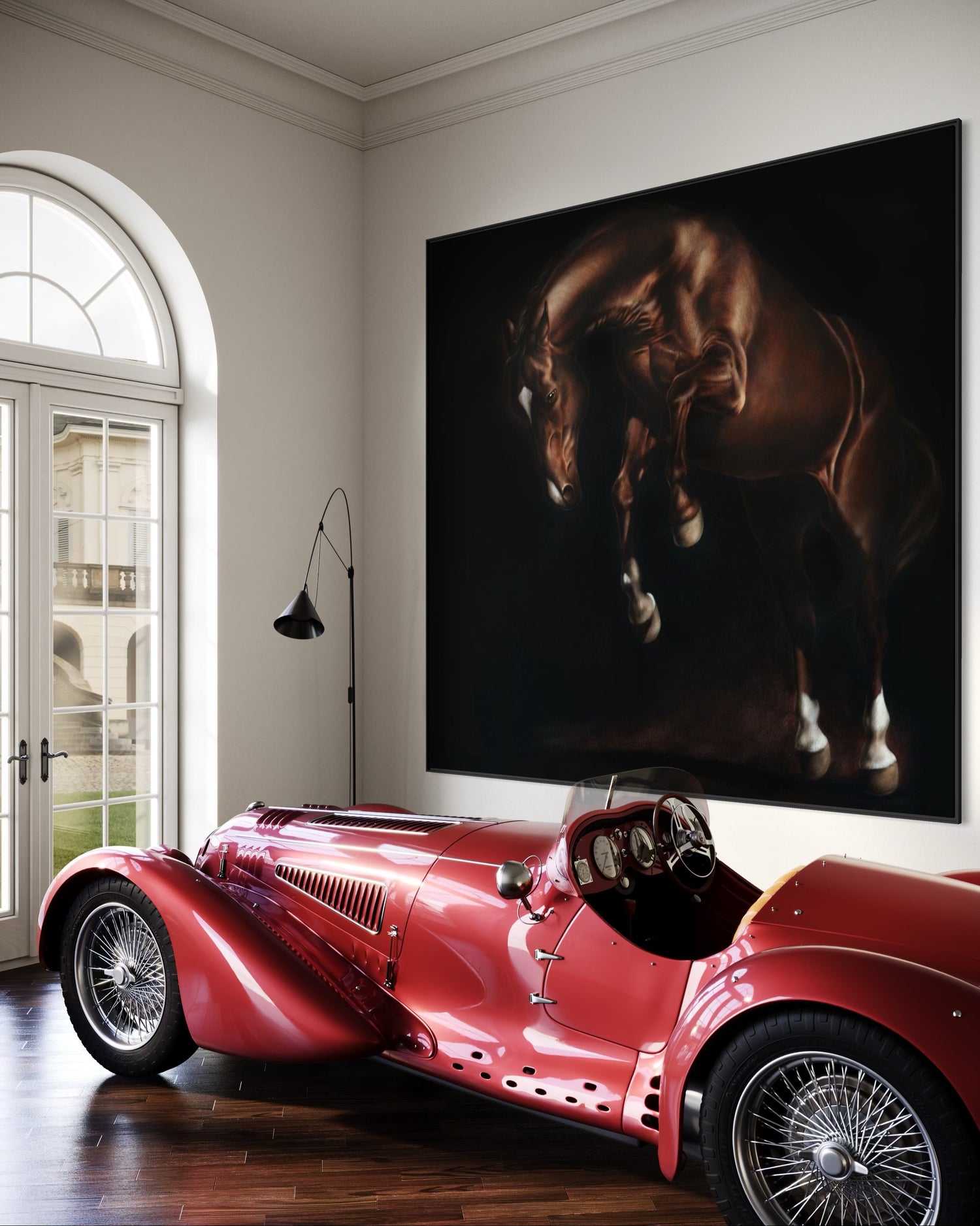 Une fois l’étude approuvée, la peinture à l’huile finale est exécutée avec soin et précision par l’artiste de renom Éloïse Brodeur. Il en résulte une œuvre intemporelle, conçue pour honorer le cheval avec toute la noblesse que sa présence inspire.