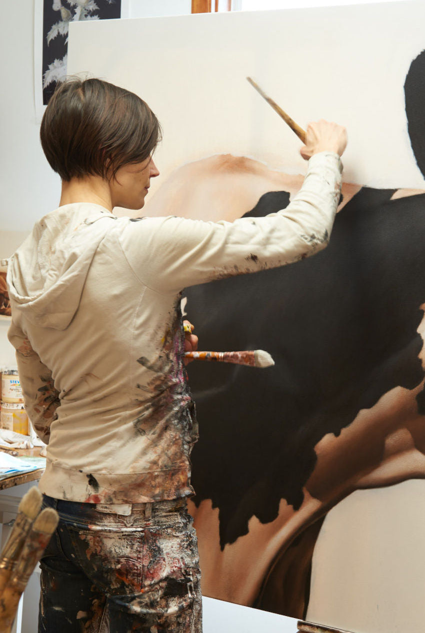 Through her work, the artist explores the themes of life in contrast and consumption, abundance, excess and over-production. Brodeur is fascinated by how perspective and intent can change the banal into the extraordinary. Her painting of cows reflect this exploration of reinterpreting the ‘everyday’ through attention and awareness to find an ‘ideal’. Presented on monochromatic backgrounds, with their pastures stripped away, Brodeur decontextualizes the cow, and our preconceived notions of it. The blank space around the cow creates room to see it, and ourselves, differently; we are freed from the superfluous chatter of our own expectations and compelled to look directly at that which the frenetic pace of life would have us pass by. Brodeur expresses her pursuit of the essential by tightening her composition, bringing us closer to her subject and emphasing the cow’s unique presence. Brodeur’s rendition with a near-monochromatic palette reflects the tranquility and equinamity of her subjects. Relieved of its busy pastoral environment, and presented on a flat, monochromatic backdrop, the cow inhabits a space of purity and equilibrium, inviting serenity and introspection.